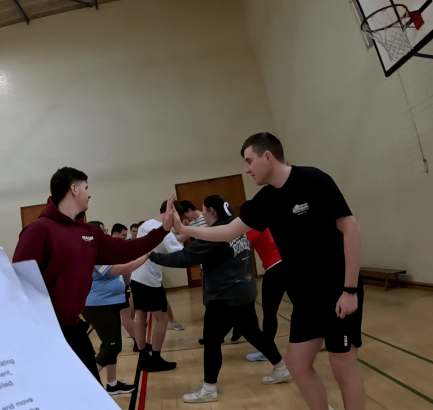 The groups continued to palm push each other across the gym for the five minutes duration. This is an Aikido or Tai-Chi exercise for children to learn palm -push techniques and balance through reciprocal base movement where each person supports the other with their back and palm pressure while moving into each other’s area. To advance and to retreat through small movements and a palm focus of strength.