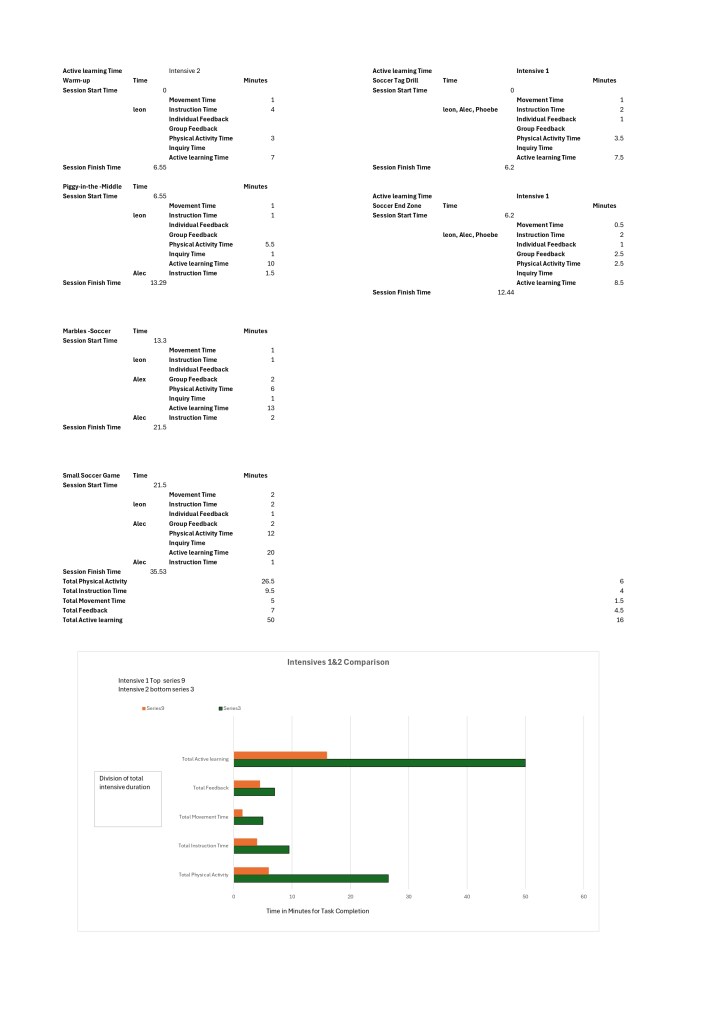 As a comparison between the two different intensives the total time for all the actual Physical Activity, Movement Time, Feedback Time, and Total Learning Time from the participants was calculated. The Total Instruction Time from the coach has been calculated.